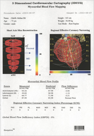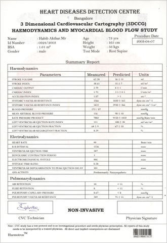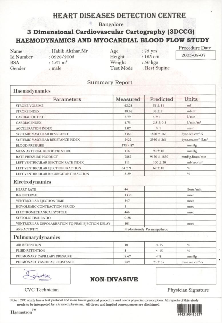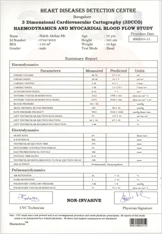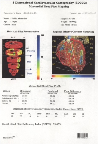 Hear is a case of a 73 year old Man who was under the cardiac care in a reputed Hospital He was under different medicines. He took our consultation on 15th may 2003 we had done the CVCG of the patient before the starting of the case as well as in August 2003. We asked the patient to discontinue all allopathic medicines with in a week of starting of our treatment. At start he had a blood flow deficiency of around 40% in a span of 2 months it has become 0%. Also his total health has become absolutely Normal with out any medicines from allopathic and we also discontinued our medicines after the satisfactory results. Any one like to interview the patient can talk to him over Phone. The total medication in this case was only 2 doses of NUX 1m